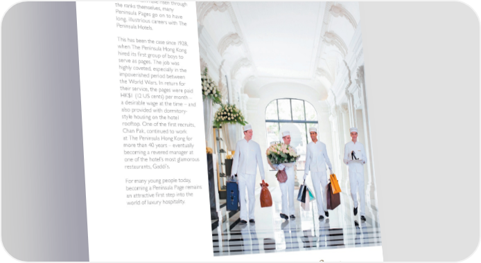 JOINING THE PENINSULA FAMILY When new pages join one of The Peninsula properties, they not only become part of a celebrated tradition of discriminating service; they also become part of an esteemed cohort. Under the mentorship of their superiors, some of whom have risen through the ranks themselves, many Peninsula Pages go on to have long, illustrious careers with The Peninsula Hotels. This has been the case since 1928, when The Peninsula Hong Kong hired its 昀椀 rst group of boys to serve as pages. The job was highly coveted, especially in the impoverished period between the World Wars. In return for their service, the pages were paid HK$1 (12 US cents) per month – a desirable wage at the time – and also provided with dormitory- style housing on the hotel rooftop. One of the 昀椀 rst recruits, Chan Pak, continued to work at The Peninsula Hong Kong for more than 40 years – eventually becoming a revered manager at one of the hotel’s most glamorous restaurants, Gaddi’s. For many young people today, becoming a Peninsula Page remains an attractive 昀椀 rst step into the world of luxury hospitality. An attractive rst step into the world of luxury hospitality 4